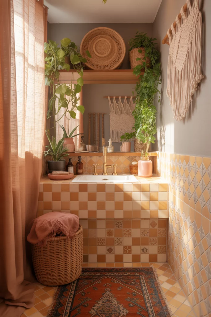 To achieve bohemian flair, layer tiles of varying patterns, woven mats, and colorful fabrics. Use shades of green, blue, or pink to shift the accent towards your mood. Main fixtures should remain simple and neutral, allowing for cozy and artistic sensations without feeling chaotic.