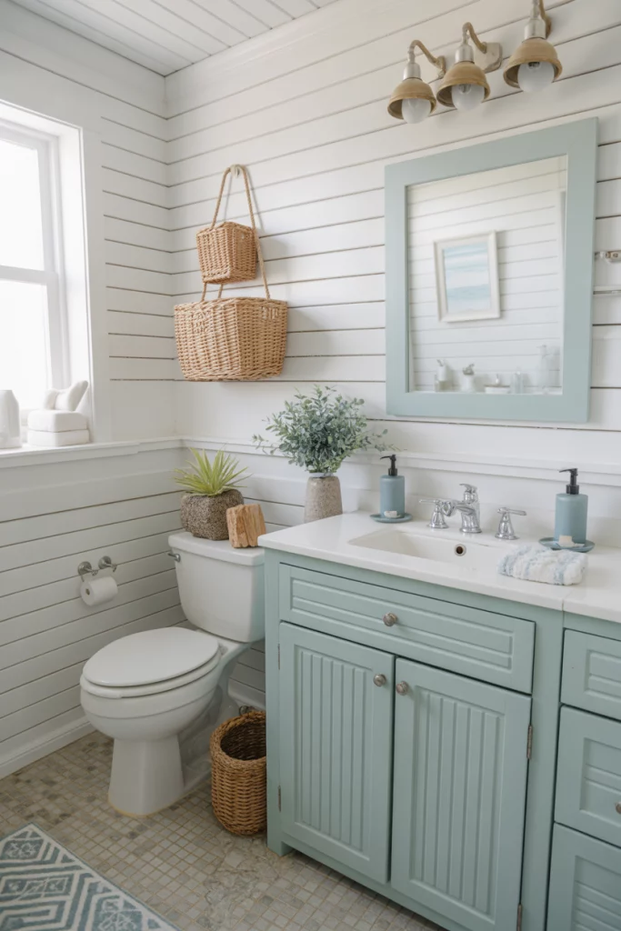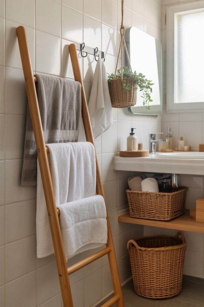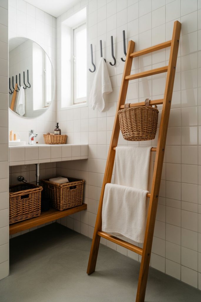 Vertical storage is vital in small bathrooms. Install wall ladders, shelves above the washing machine, or hidden hooks behind the mirrors. Go for modern, decorative designs. Add a few extra baskets made of rustic rattan for a touch of warmth while helping keep things orderly and clutter-free.