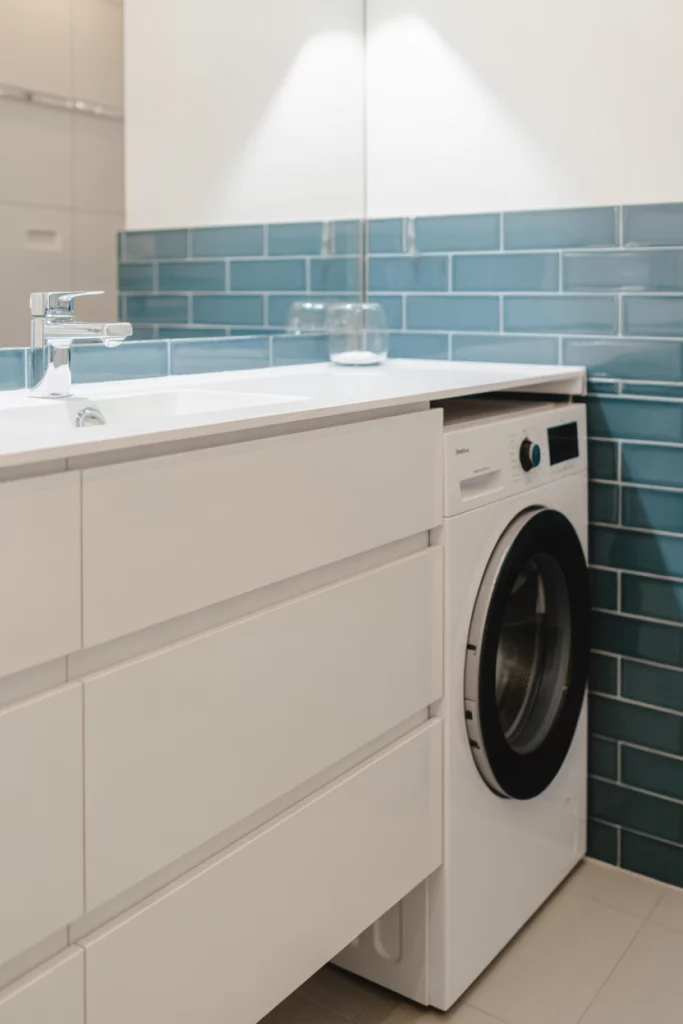 A floating vanity along with a compact wash machine preserves open floor space while adding necessary functionality. Light warm toned woods or soft coastal blue hues promote a calmer atmosphere. Integrated drawers help with a clean aesthetic while providing storage for towels and toiletries. This is a real bonus for small homes or studio apartments.
