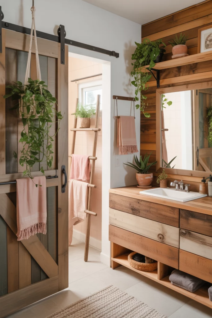 Shelving from reclaimed wood, sliding barn doors and matte black metalware evokes a rustic vanity. A touch of foliage or pink towels create contrast between warm and cool tones. The layout and shelving is kept simple and warm to promote functionality. This rustic vanity design suits country homes beautifully and any one else looking for earthy authenticity.