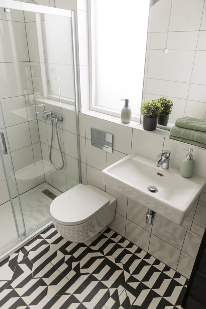 Black and white is a timeless combination. The use of geometric tiles, checkerboard floors, or subways walls with dark grout and contrasting elements generates sophistication. Paired with minimal décor, sleek lighting enhances the overall ambiance. Soft blue or green decorative elements create a subtle balance of color without overpowering the space.
