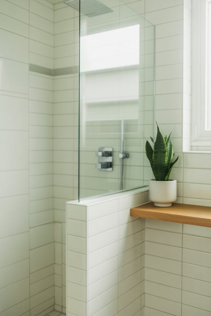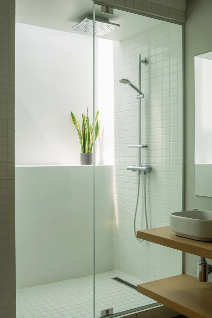 A minimalist spa look makes even a small bathroom feel peaceful. Smooth surfaces, hidden storage, and soft green accents enhance serenity. A frameless shower only setup with pebble flooring feels natural yet modern. Add a wooden stool or small plant for a balanced, calming effect. Less clutter means more comfort.