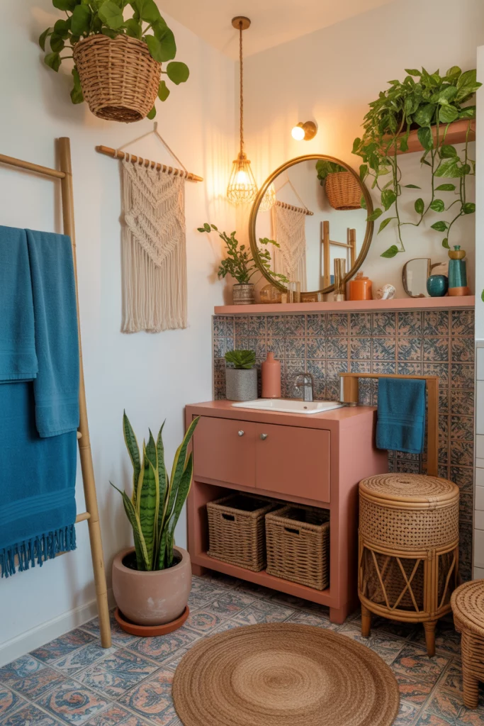 For expressive souls, bohemian bathrooms are all about color, texture, and warmth. Mix woven baskets, patterned rugs, and blue or pink ceramics. Keep your shower area clean-lined to balance the look. Layered textiles and plants make it feel alive and creative. This style fits anyone who loves cozy, artistic chaos.