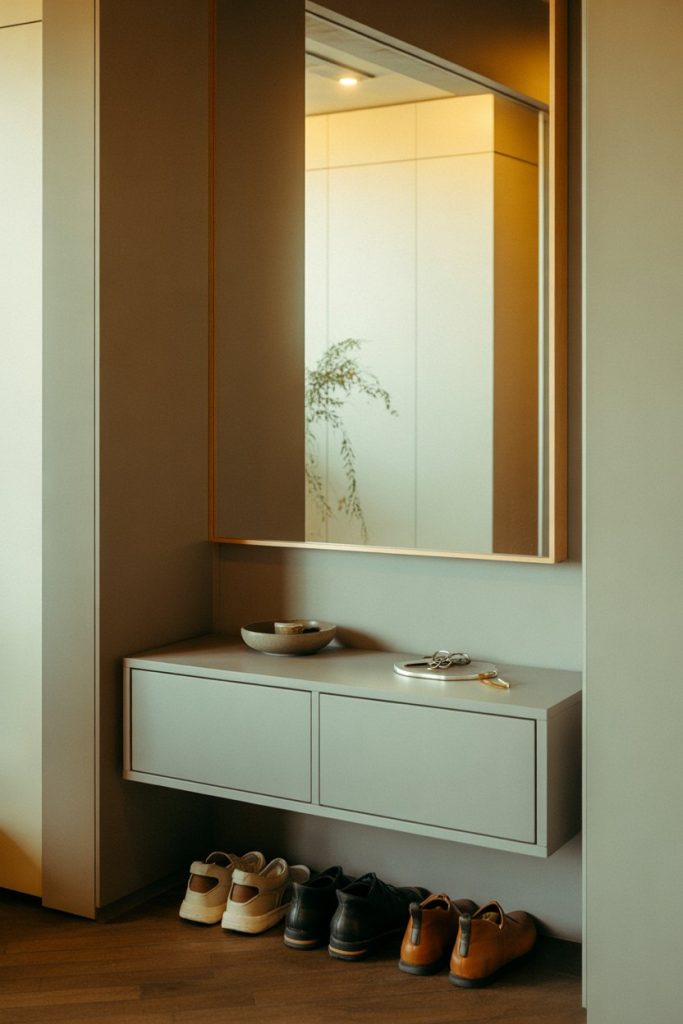 When your apartment entrance barely fits a doormat, a wall-mounted console with concealed compartments becomes essential. These streamlined pieces tuck shoes behind flip-down panels or sliding doors while providing a landing spot for keys and mail. The design keeps your narrow space from feeling cluttered, and the visual lightness of a floating shelf makes the area feel larger than it actually is.