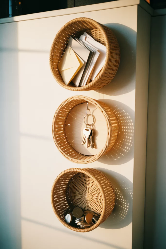A trio of shallow woven baskets mounted on the wall brings warm texture and corrals the small stuff that tends to scatter. One basket for mail, one for keys, and one for odds and ends like hand sanitizer or reusable shopping bags. The natural fiber adds a boho softness that contrasts nicely with hard surfaces, and the open weave keeps contents visible so nothing gets forgotten.