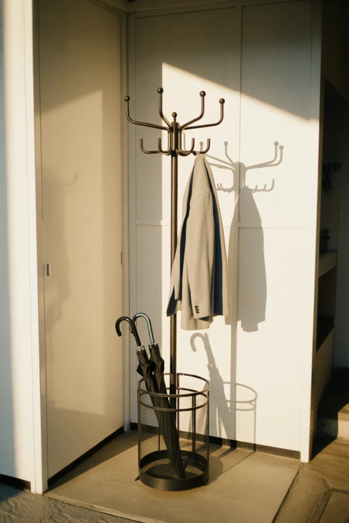 A freestanding coat tree with an integrated umbrella tray occupies minimal square footage while handling outerwear for the whole household. The vertical structure keeps jackets off the floor, and the weighted base prevents tipping when you yank off a heavy winter parka. This piece works well in homes where wall-mounting isn’t an option or the layout makes a coat closet impractical.