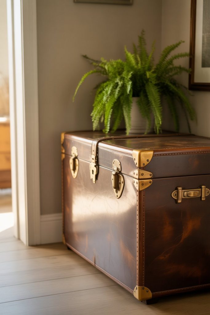 An old steamer trunk or military footlocker provides storage with character that you can’t get from mass-produced furniture. The hinged lid hides seasonal items like winter scarves or beach towels, and the flat top serves as a surface for a table lamp or small plant. This approach appeals to anyone drawn to farmhouse or eclectic styles where history and patina add warmth.