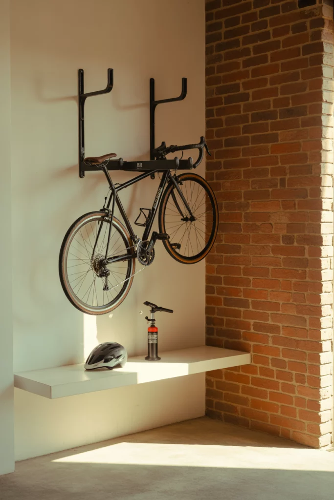 A wall-mounted bike rack paired with a low storage shelf turns a narrow entry into a cyclist’s launch pad. The bike hangs vertically to save floor space, and the shelf below holds helmets, pumps, and repair kits. This setup is common in urban apartments where bike parking isn’t available in the building and bringing your ride inside is the only secure option.
