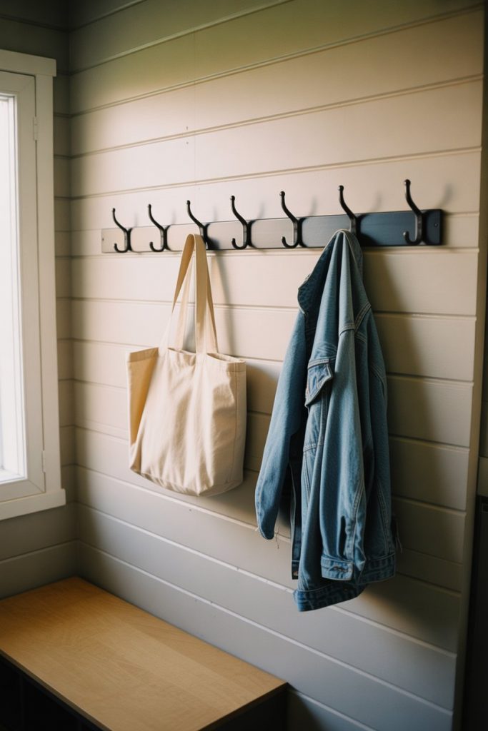 Southern homeowners often add a small bench underneath for pulling off boots after yard work, while city dwellers might skip the bench to preserve walking space. The shiplap adds texture without color, so it plays nicely with whatever paint scheme you choose for adjacent rooms. Just make sure your hooks are rated for at least ten pounds each—winter coats are heavier than you think.