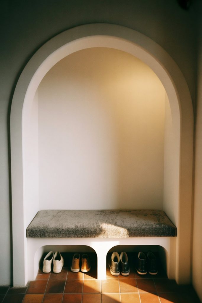 If you’re renovating or building new, consider carving an arched niche into a blank wall for a built-in bench with cubbies. The architectural detail adds elegance that feels permanent and intentional, while the seating makes the cozy entry more inviting. This approach is most common in Spanish Colonial or Mediterranean-inspired homes, but it translates beautifully to contemporary spaces when executed with clean lines.