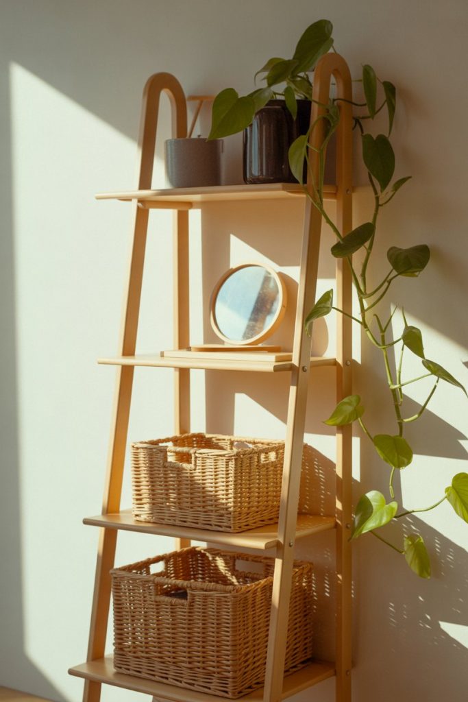 A leaning ladder shelf wedged into a corner uses vertical space without demanding floor footage. The tiered design offers spots for storage baskets, a small mirror, and a trailing pothos that softens the geometry. It’s a go-to solution for renters who can’t drill into walls or homeowners who want flexibility to rearrange on a whim.