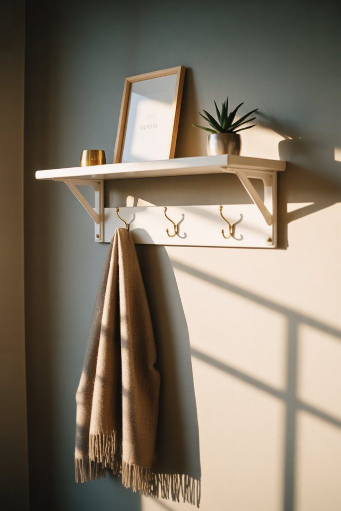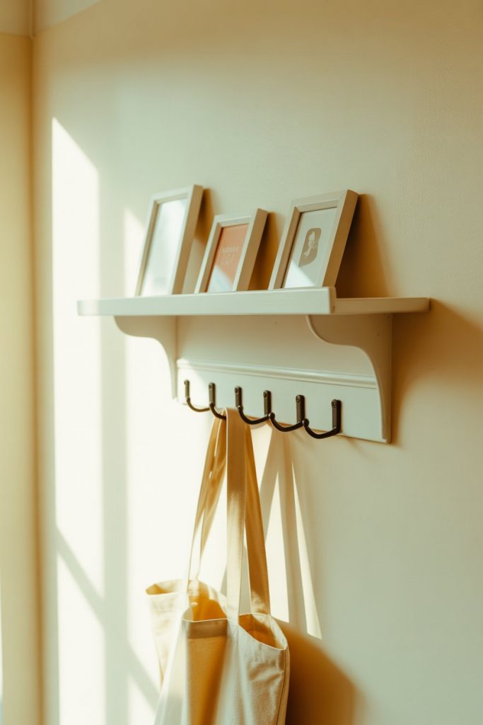 A single floating shelf paired with understated metal hooks delivers modern restraint without sacrificing utility. The horizontal line of the shelf acts as a visual anchor in narrow hallways, while the hooks below keep outerwear off the floor. This design avoids the top-heavy look that comes from mounting shelves too high or piling on too many decorative objects.