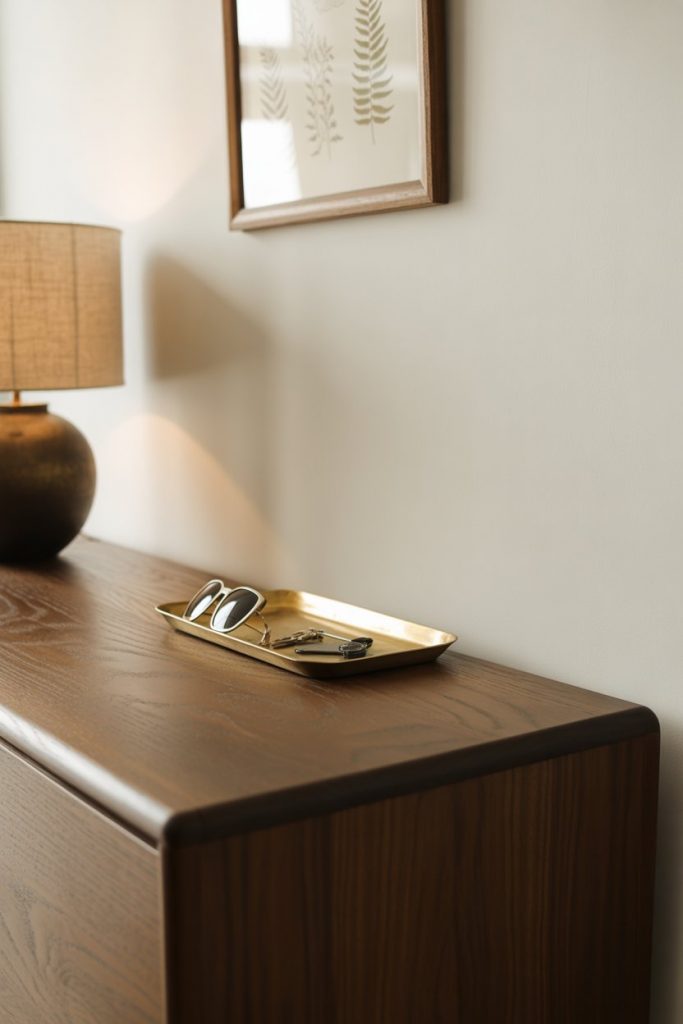 A slender console table paired with a decorative tray creates a dignified landing zone for everyday essentials. The tray corrals keys, sunglasses, and wallets so they don’t migrate across the surface, and the table’s legs keep the floor underneath clear for shoes or bags. This approach appeals to anyone who wants their apartment entrance door to feel intentional rather than improvised.