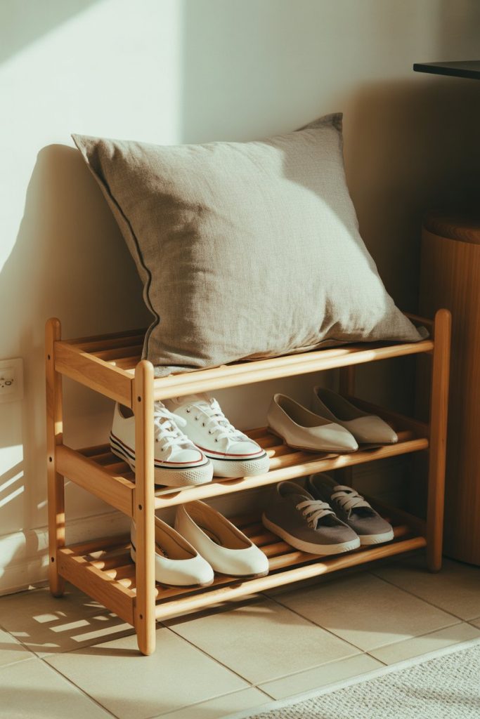 A compact shoe rack topped with a padded cushion serves double duty: shoe storage below and a perch for pulling on boots above. The two-tier design keeps everyday footwear visible and accessible, which matters when you’re rushing out the door. This piece fits neatly beside a front door without blocking the swing, making it a practical choice for tight quarters.