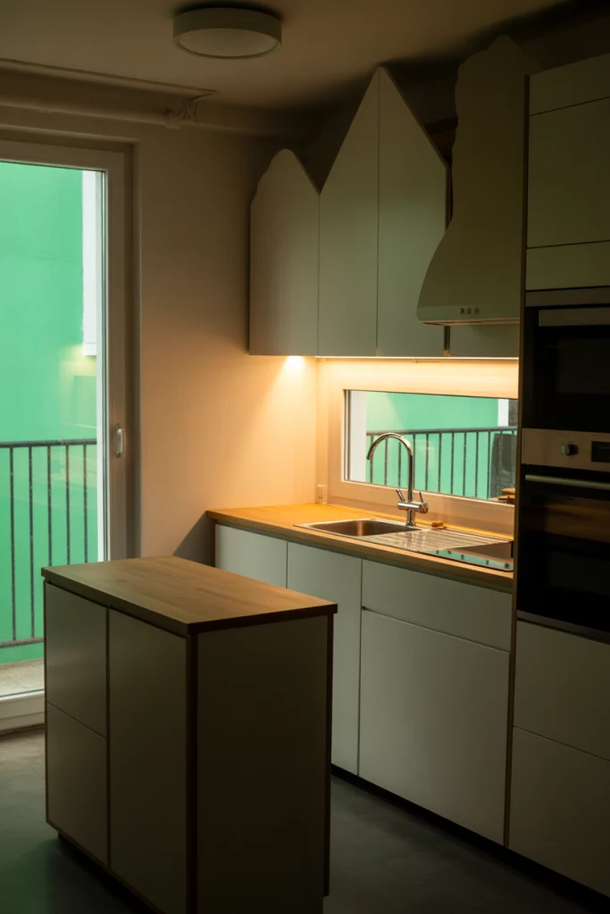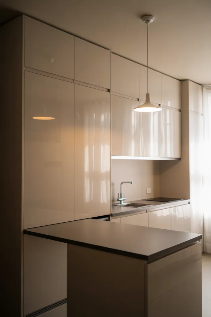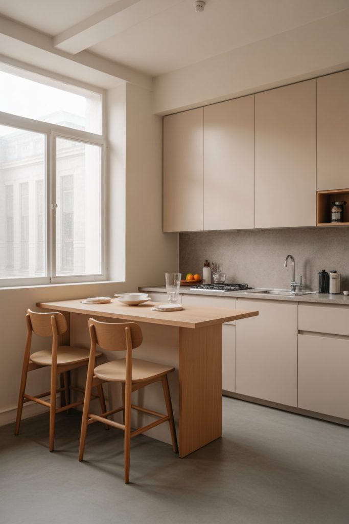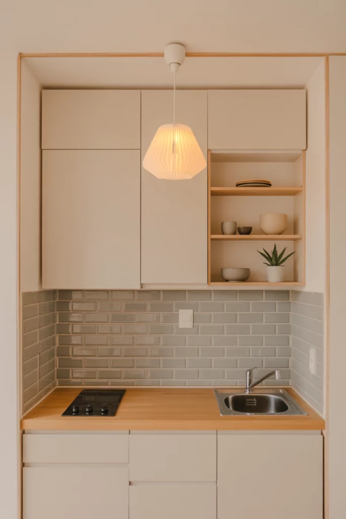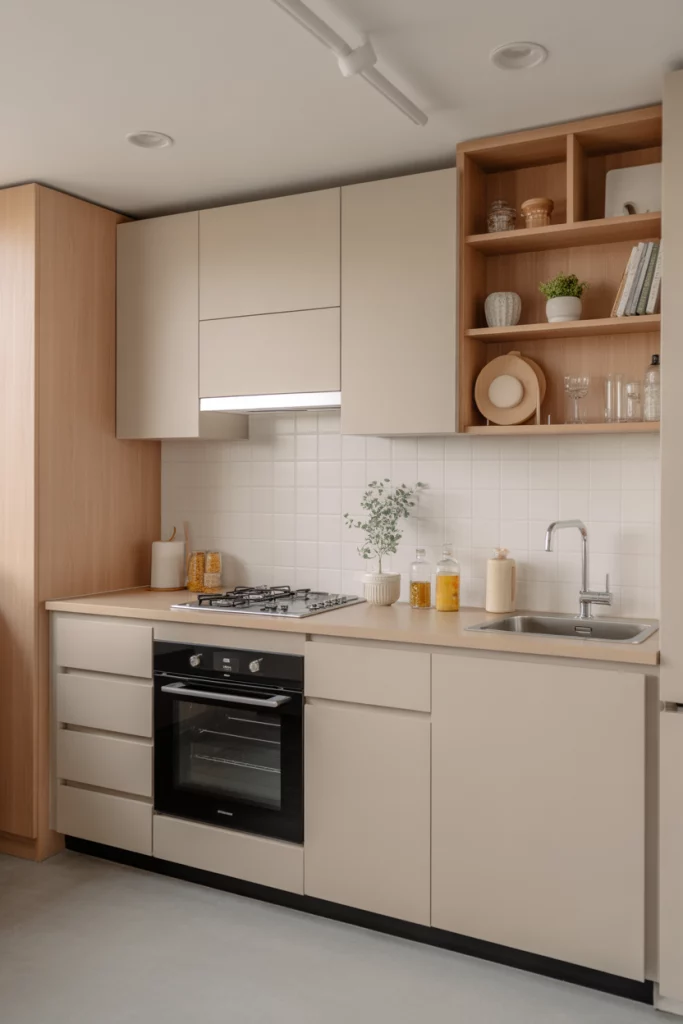 A fold-away kitchen is a very smart idea for micro apartments. Cabinets and counters can be closed off like a wardrobe, hiding clutter instantly. This style is popular in European modern simple designs, where every square foot counts. I once stayed in an Airbnb with this layout, and it amazed me how functional a tiny corner could be. With extra folding panels, you can even integrate a hidden island. Curbed often explores foldable solutions for urban kitchens.