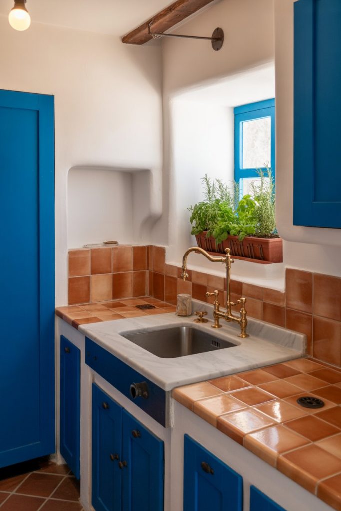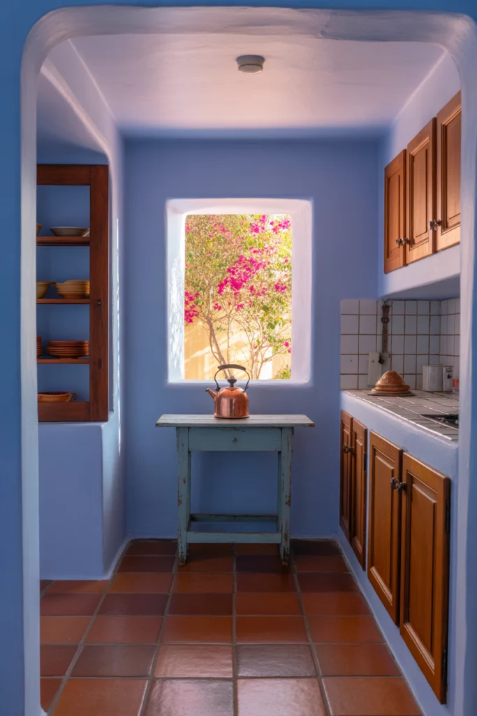 A Mediterranean kitchen idea brings sunlit charm with terracotta tiles, whitewashed walls, and blue color accents. Even a 2mx2m kitchen glows with this aesthetic, giving off a breezy vacation feel. I once visited a friend’s seaside farmhouse where the kitchen was tiny but unforgettable thanks to its rustic tiles and olive-wood shelves. Adding ceramic jars and compact wall storage makes it both practical and beautiful. House & Garden often praises Mediterranean kitchens for their timeless appeal.
