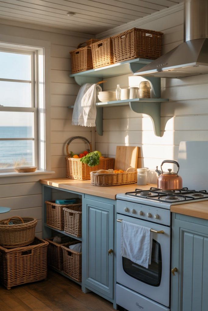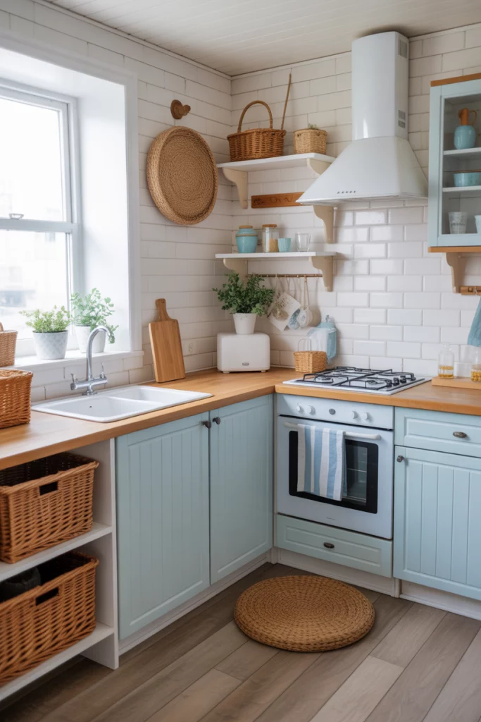 The coastal cottage style works even in small kitchens by using soft whites, light blues, and weathered wood. It creates a very calming aesthetic reminiscent of beach houses. I once visited a farmhouse on Cape Cod where the layout was just 2mx2m, but it felt airy thanks to open shelves and breezy decorating. Extra woven baskets and simple lighting complete the look. Better Homes & Gardens often features coastal kitchens for their charm.