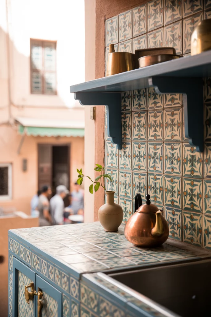 For bold decorating, Moroccan-inspired tiles bring striking patterns and vibrant color into compact kitchens. Even a 2mx2m space shines when paired with simple wood shelves and brass fixtures. I once cooked in a friend’s Moroccan apartment kitchen, and the backsplash alone felt like art. It’s an aesthetic choice that feels very lively while offering easy-to-clean surfaces. Architectural Digest frequently showcases Moroccan kitchens for their personality.