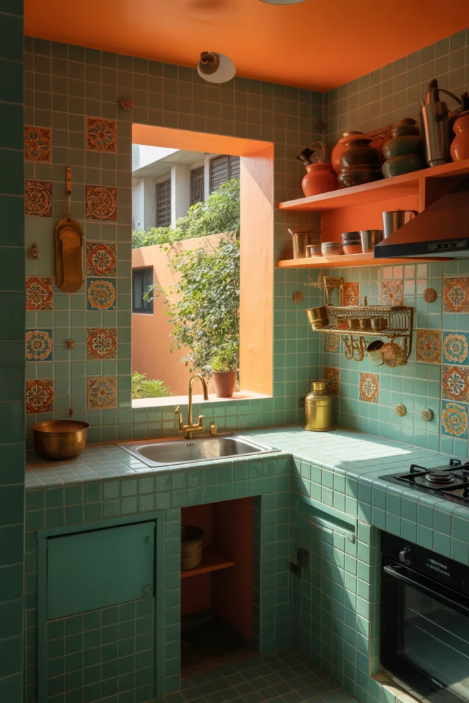 An Indian kitchen style is bold with color, spices, and smart storage tricks. Even a 2mx2m kitchen can feel rich when decorated with patterned tiles, brass handles, and layered textiles. I once stayed in a homestay in Jaipur where the kitchen was tiny but bursting with life thanks to these details. Adding vertical racks and pull-out drawers ensures that the look stays practical, not cluttered. Publications like Architectural Digest India often praise these vibrant choices.