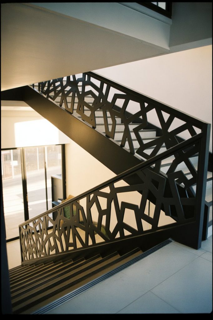 For homeowners who see their staircase as a canvas, unique artistic designs offer endless possibilities. Think custom laser-cut metal panels with geometric patterns, sculptural wood carvings, or mixed-material installations that double as functional art. These railings are conversation starters and perfect for anyone who wants their home to reflect personal style and creativity.