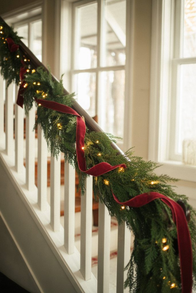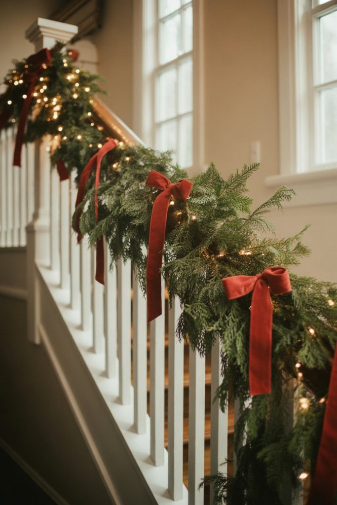 If you love going all out with Christmas decor, your stair railing can be a stunning display space for garland, lights, ribbons, and ornaments. Traditional wood balusters and painted white railings provide the perfect backdrop for seasonal styling—secure attachment points make it easy to drape greenery without damaging the finish, and the classic look complements holiday aesthetics beautifully.