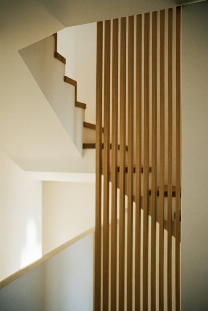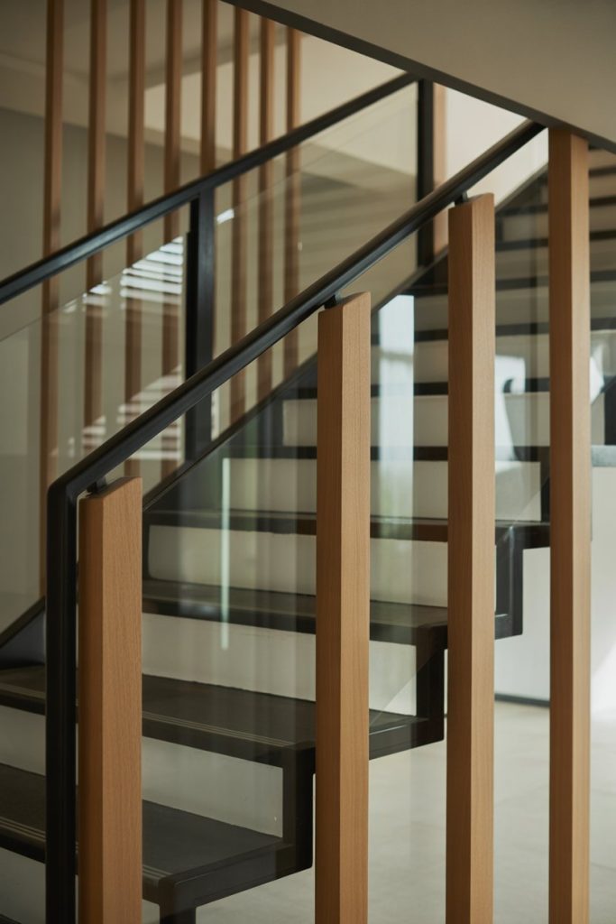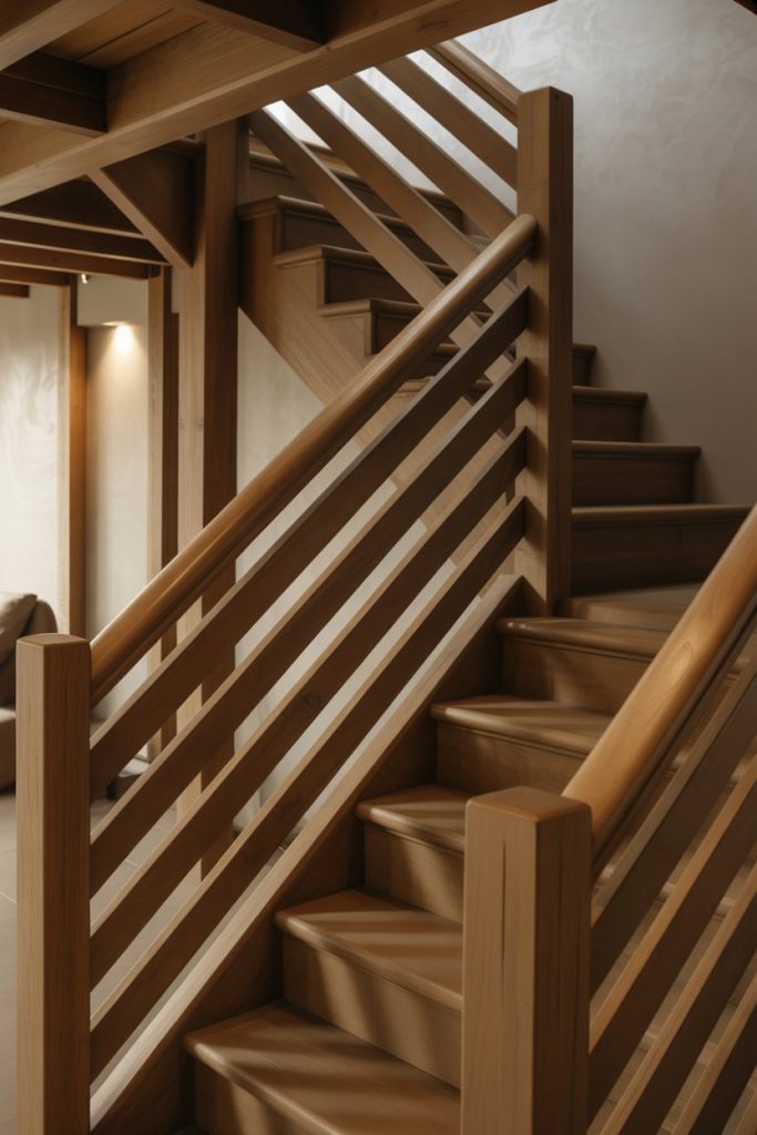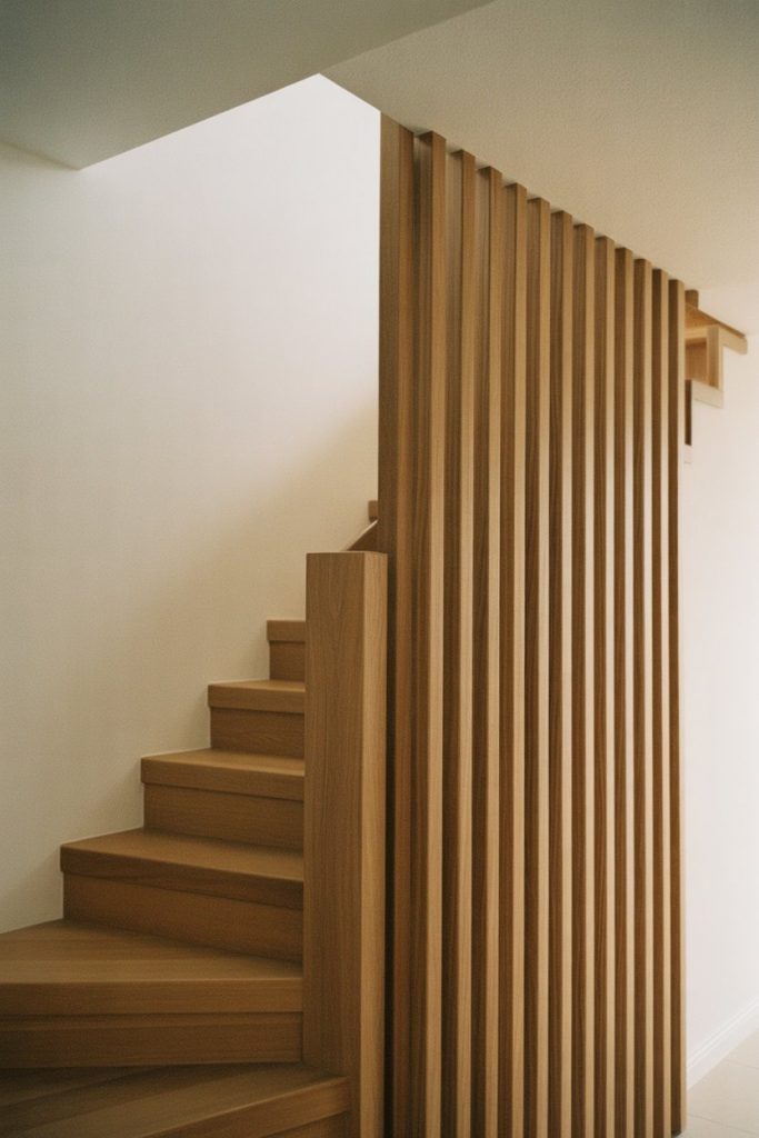 Vertical slat railings—featuring evenly spaced wood or metal slats running perpendicular to the staircase—offer a clean, modern look with strong geometric appeal. The vertical lines draw the eye upward, making ceilings feel higher and spaces more open. Choose light wood for Scandinavian vibes or go dark for a bold, dramatic statement.