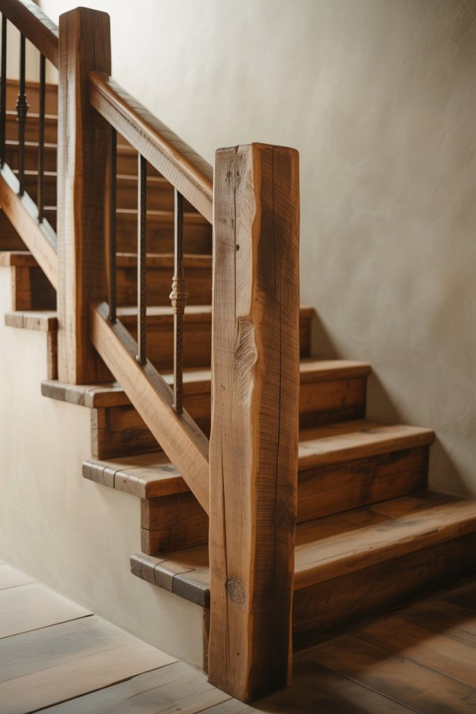 For a true rustic farmhouse aesthetic, nothing beats reclaimed wood railings. Weathered barn wood, salvaged beams, or distressed lumber bring history and character to your staircase, and every scratch, nail hole, and grain pattern tells a story. Pair with simple iron brackets or rope details for a look that’s rugged, authentic, and deeply rooted in American country traditions.