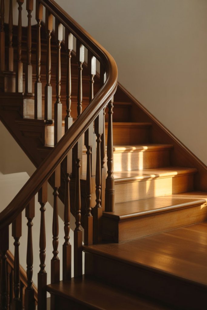 This style thrives in Colonial, Victorian, and Craftsman homes where architectural detail matters. Real homeowner behavior: many people who inherit these railings want to paint them white or replace them entirely, but refinishing the wood and embracing the original design often yields a more beautiful, authentic result. A common mistake is using a glossy polyurethane that looks plasticky—opt for satin or matte finishes that let the wood grain shine without excessive shine.