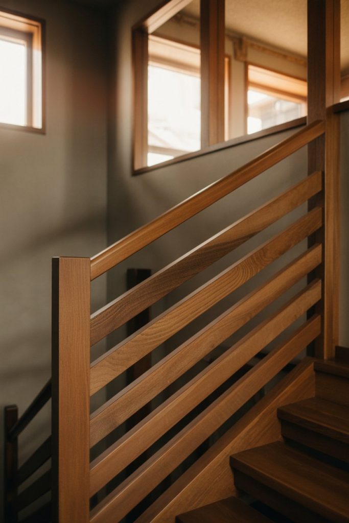 If vertical slats feel too busy, horizontal wood plank railings offer a simpler, more grounded alternative. Wide planks running parallel to the stairs create a contemporary or rustic look, depending on your finish choice. Pair with a chunky wood handrail for a cohesive, natural aesthetic that feels warm and approachable.