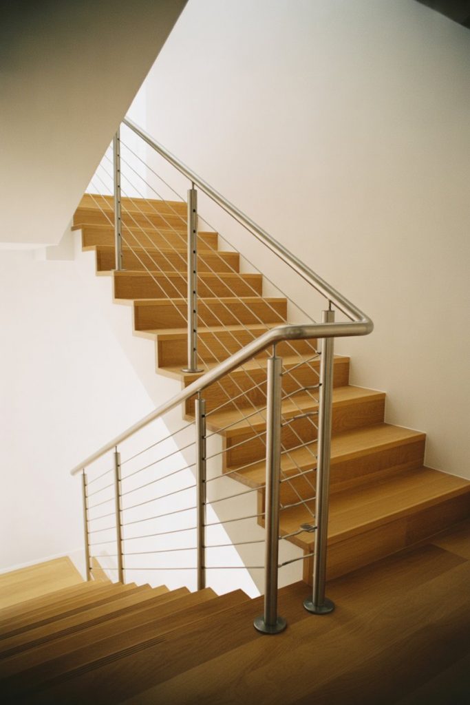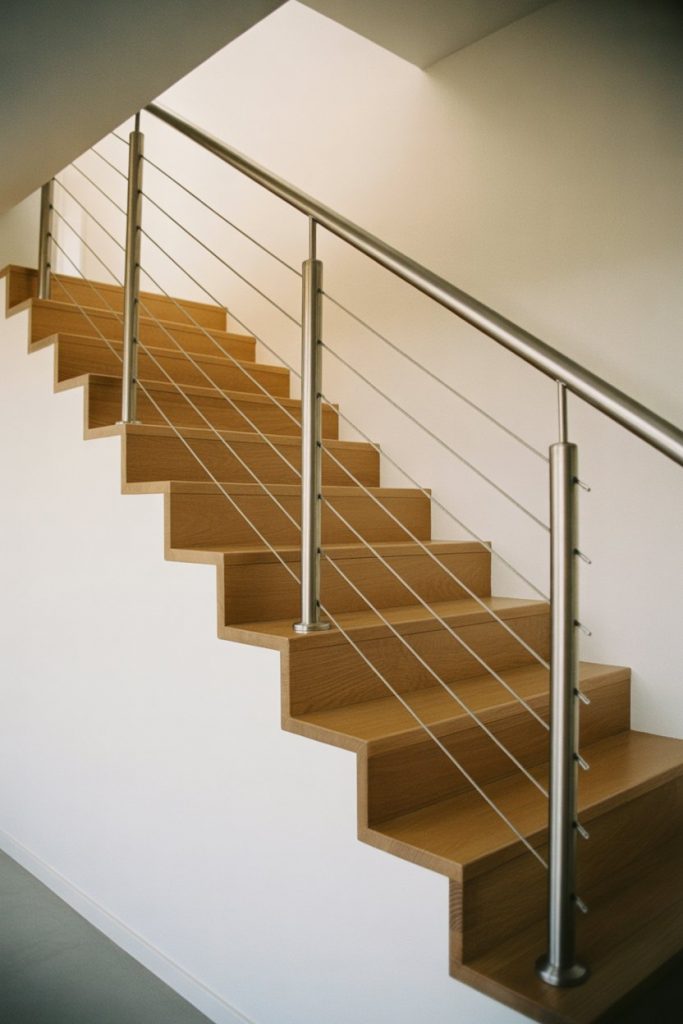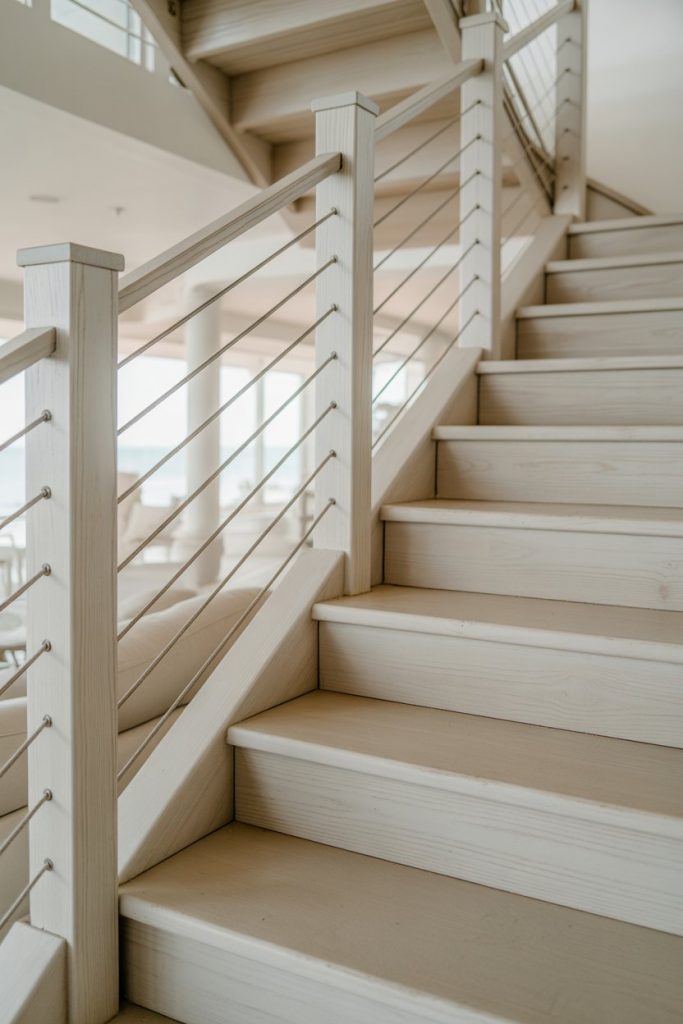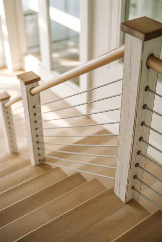 Nothing says coastal living quite like horizontal cable railings. These thin stainless steel cables run parallel to the staircase, creating a nautical, breezy feel that’s perfect for beachside homes or any space that wants to channel that relaxed, ocean-inspired energy. The design is simple, sleek, and lets light and views pass through effortlessly—ideal for homes with water views or large windows.