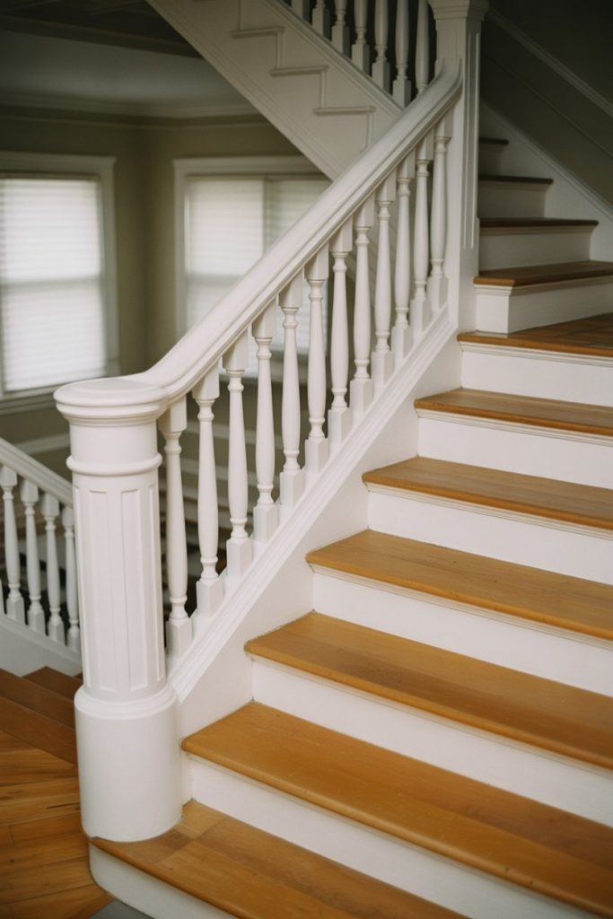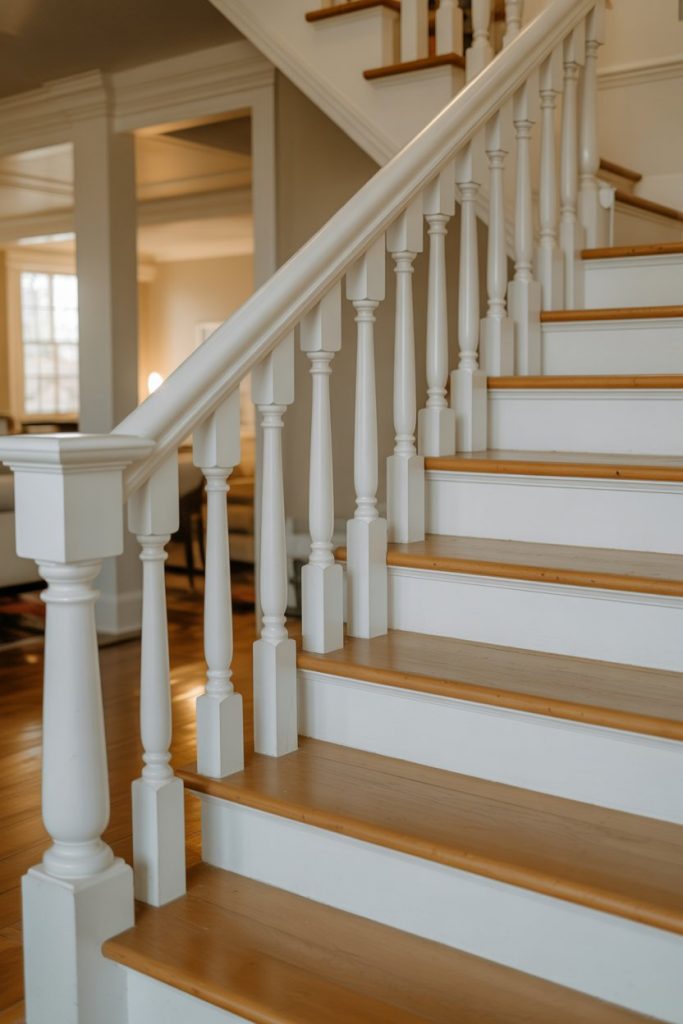 Real homeowner behavior: many people paint their railings white when updating their home before selling, as it’s an affordable refresh that appeals to a broad audience. Use a durable semi-gloss or satin finish that can handle the wear from hands and cleaning. One common mistake is skipping primer—raw wood needs it, or you’ll see bleed-through and uneven color. This look thrives in Colonial, Cape Cod, and craftsman-style homes.