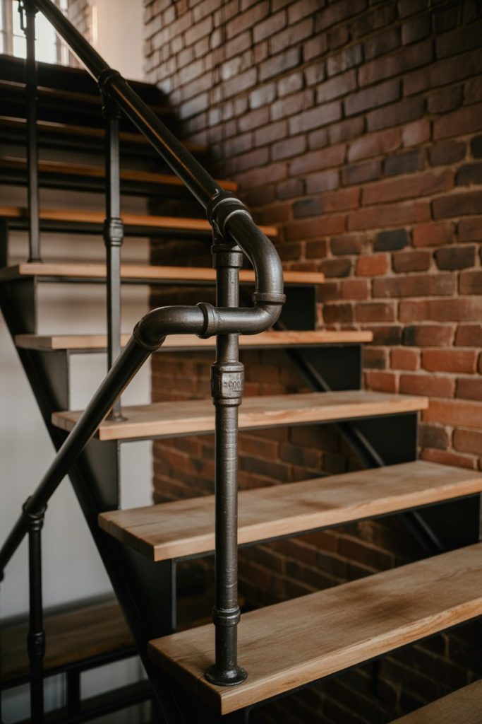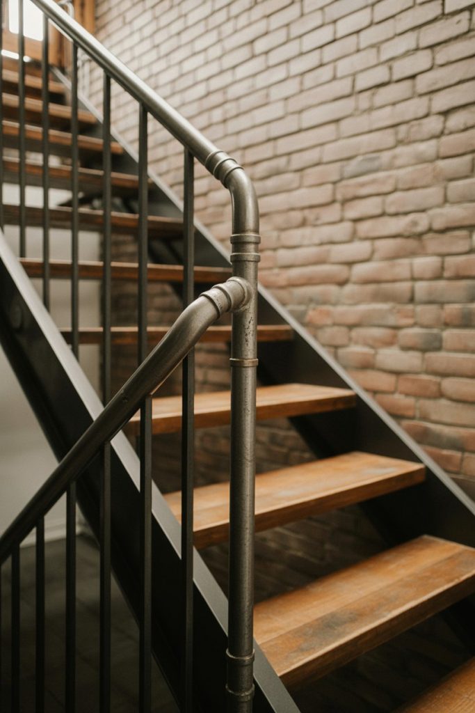 Industrial-style metal pipe railings bring an edgy, urban feel to any staircase. Using galvanized or black iron pipes with visible fittings, this DIY-friendly design is perfect for loft spaces, converted warehouses, or anyone who loves the raw, unfinished aesthetic. It’s bold, functional, and surprisingly easy to customize.