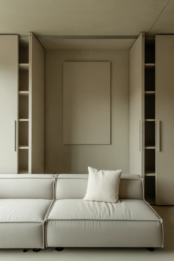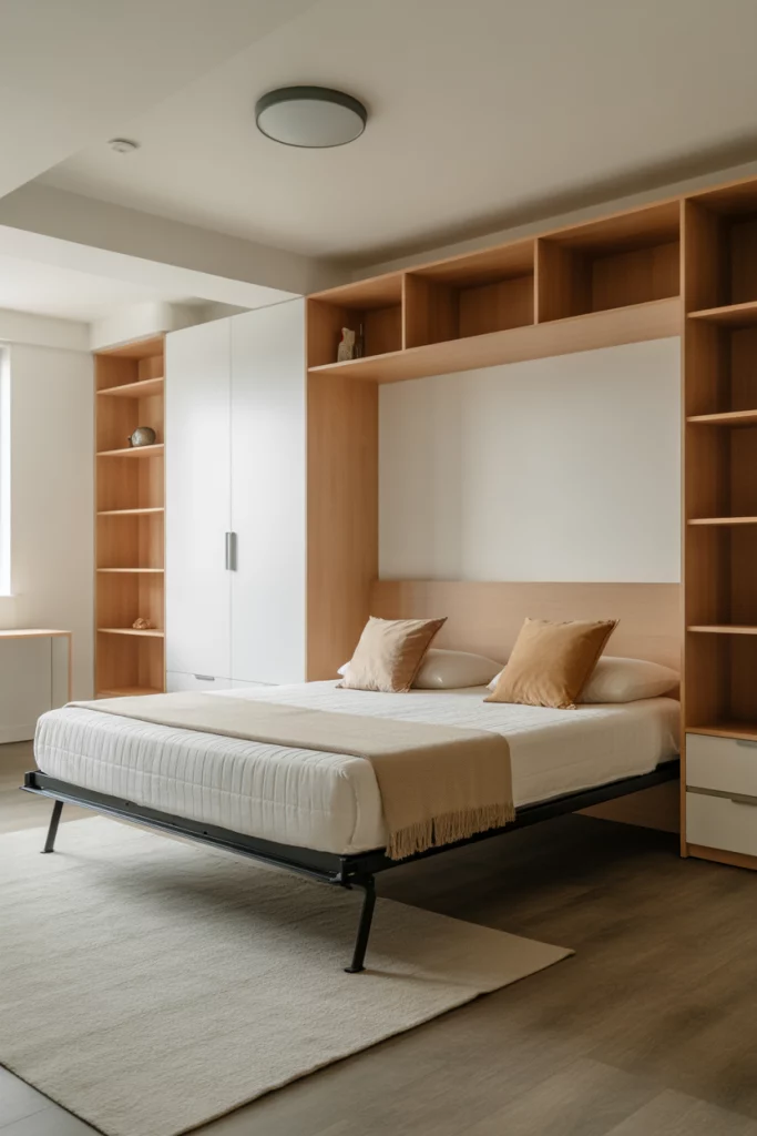 Murphy beds are back — sleeker than ever. A fold-away bed allows your tiny home to become a living room by day and a sleeping nook by night. In a 500 sq ft space, I saw this trick make the apartment feel almost large. Pair it with soft fabrics and warm tones for a cozy, human touch.