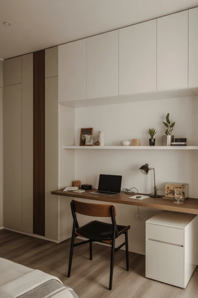 For work-from-home comfort, install a floating desk that folds down when not in use. In a 400 sq ft apartment, this keeps your layout clean and minimalist. I saw this concept in a modern Parisian micro-flat — it made the home office blend naturally with the living area while keeping the vibe light and aesthetic.