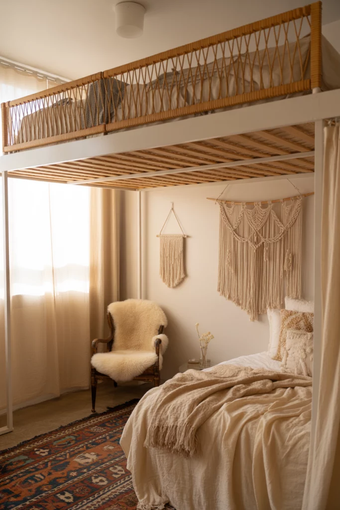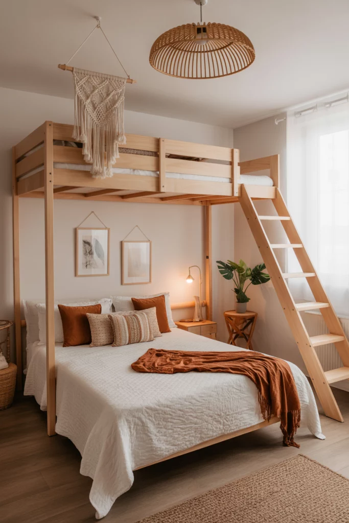 A loft bed is a clever solution for micro apartments, freeing up floor space for a desk or wardrobe. Add a Bohemian twist with woven baskets, macramé curtains, and warm lights to make it feel cute and cozy. In my first tiny cozy studio, this style turned a cramped corner into a relaxing hideaway — proof that good decorating is part art, part personality.