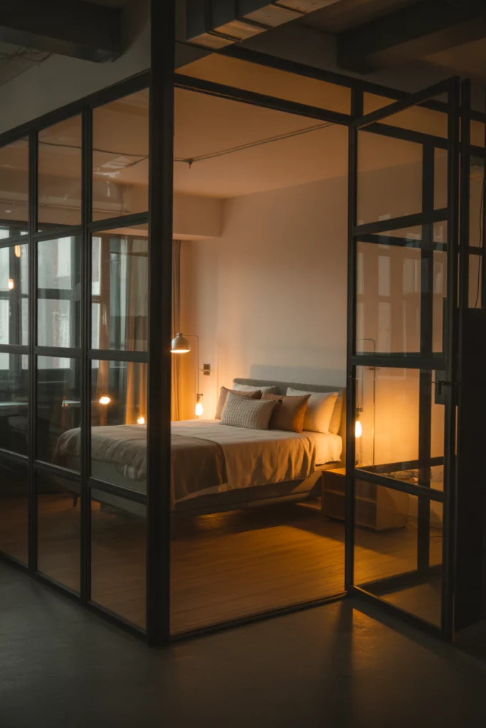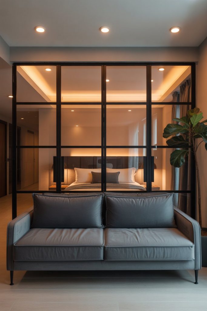 Glass partitions add a sense of separation without sacrificing light — ideal for industrial or modern studios. In a 450 sq ft loft I helped design, black steel frames and frosted glass divided the bed area from the living room perfectly. The result was cozy, sleek, and visually large.