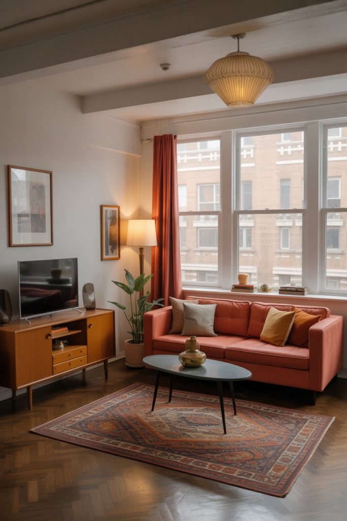 Blending vintage treasures with modern basics brings charm to any tiny apartment. Pair an antique mirror with a minimalist bed frame, or a retro chair beside a sleek kitchen counter. In my 450 sq ft rental in Copenhagen, a mix of flea-market finds and soft neutral tones gave the space both warmth and sophistication.