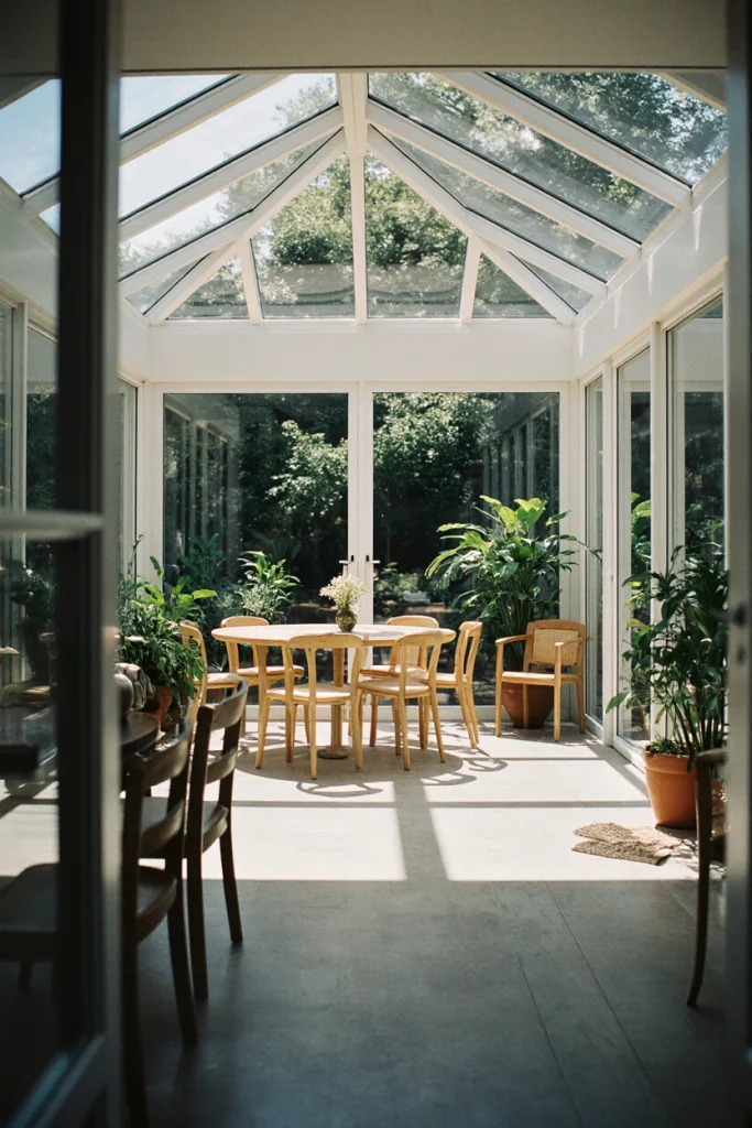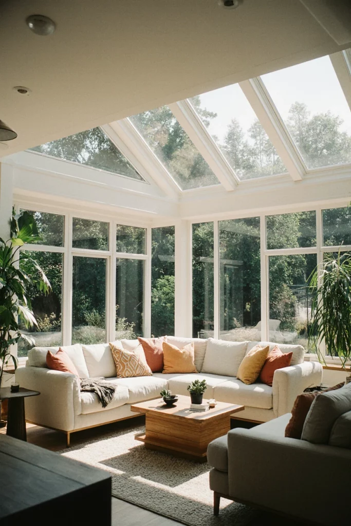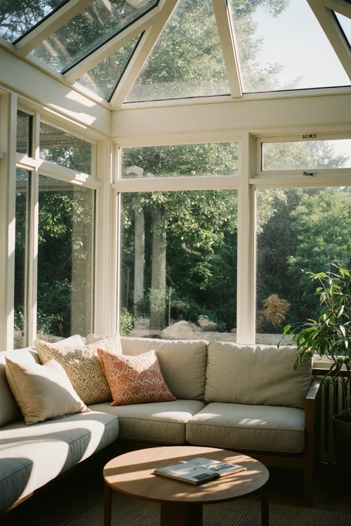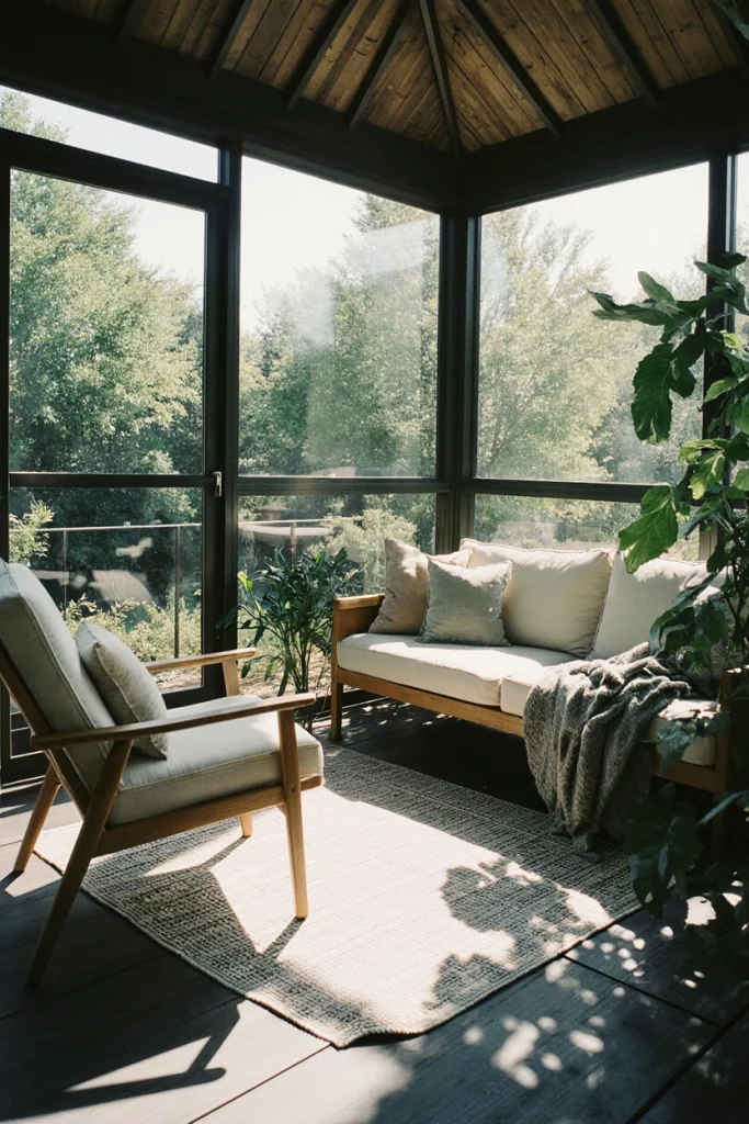 A modern sunroom with clean lines and large windows transforms the interior into an airy, light-filled zone perfect for work or rest. It’s a favorite among young professionals who need a peaceful indoor retreat that still feels connected to the outdoor surroundings. Adding plants and minimal furniture enhances clarity and reduces visual stress. Many homeowners say it becomes the room where they feel most grounded, especially during busy weeks.