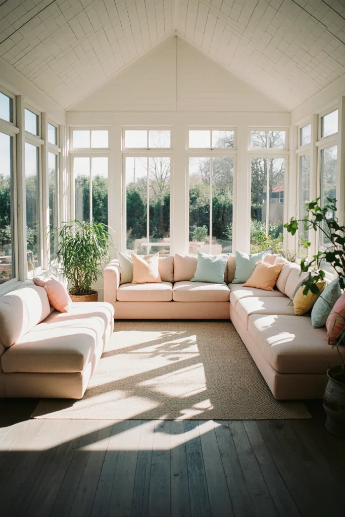 A large sunroom lounge feels like an airy extension of the home, offering space for gatherings, morning routines, and quiet evening downtime. Designers often recommend flexible furniture to keep the room open and flowing while still feeling cozy. This style works beautifully in homes where sunlight shifts throughout the day, creating soft, natural patterns across the floor. Adding plants enhances the peaceful atmosphere and makes the room feel connected to the outdoor environment.