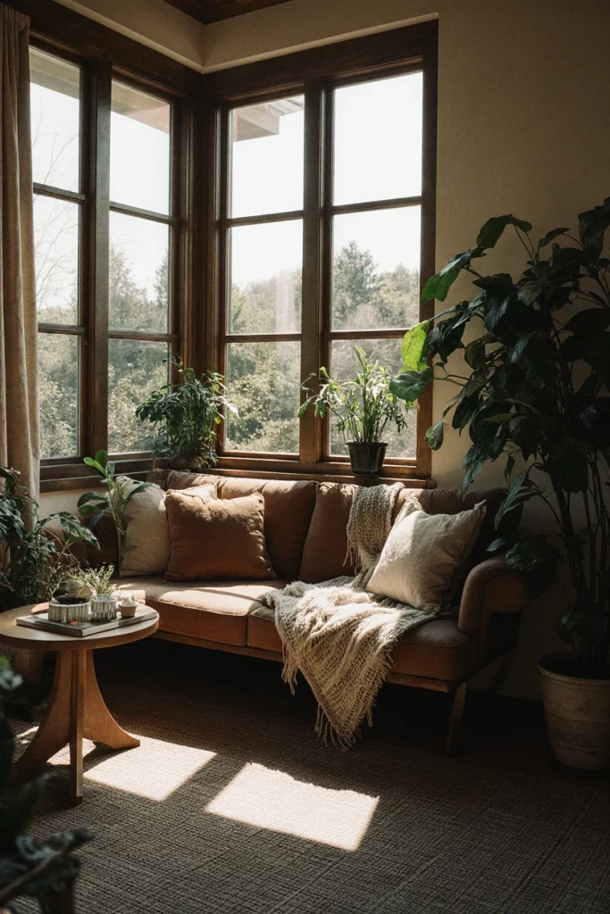 A moody sunroom with earth tones brings calm through deep colors and grounded materials. Designers often point out how this palette helps counteract stressful days, creating a serene environment for reflection. Adding textured rugs, warm lighting, and a few organic accents keeps the room from feeling too dark. With layered fabrics and soft shadows, the space becomes a deeply relaxing retreat connected to nature.