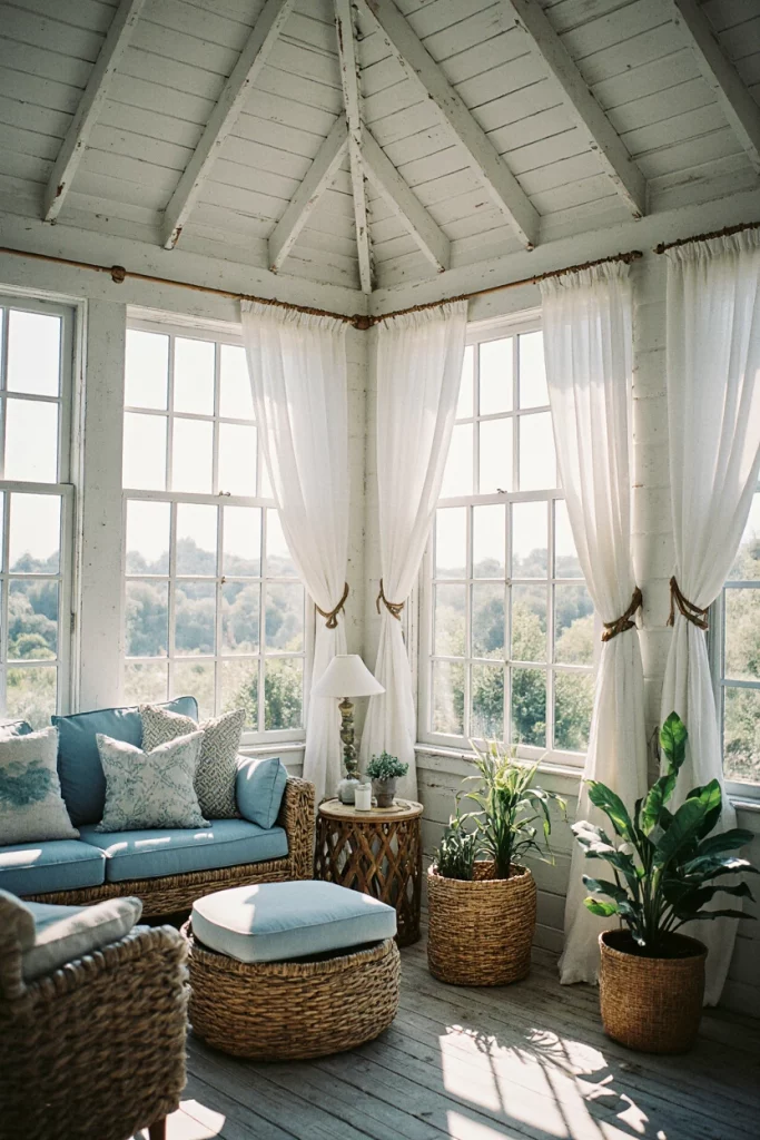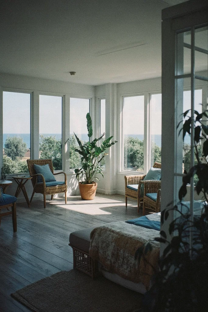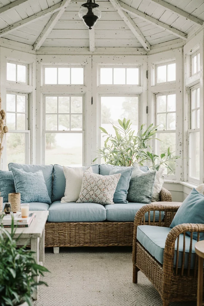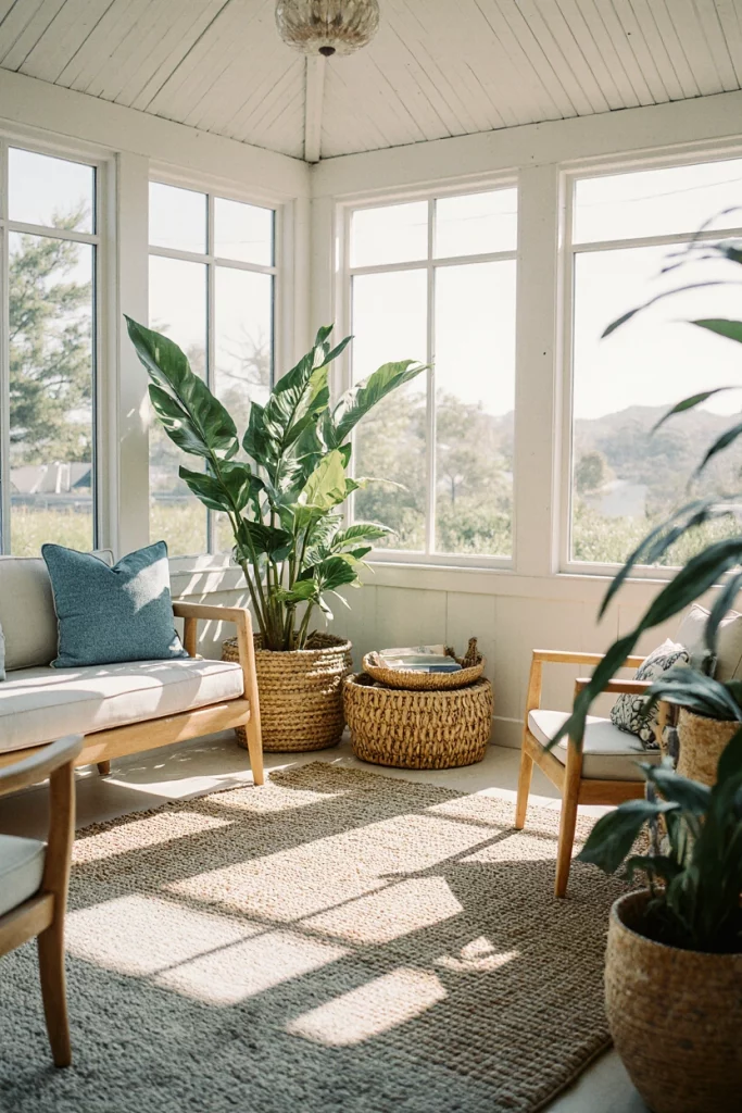 A coastal cottage sunroom features whitewashed woods, soft blue accents, and breezy fabrics that bring fresh seaside charm into the home. Many people choose this look for its uplifting, cheerful feel. The design works for tiny rooms or larger spaces and suits anyone who enjoys natural light and soft color palettes. Paired with plants and woven textures, the room becomes a soothing everyday getaway.