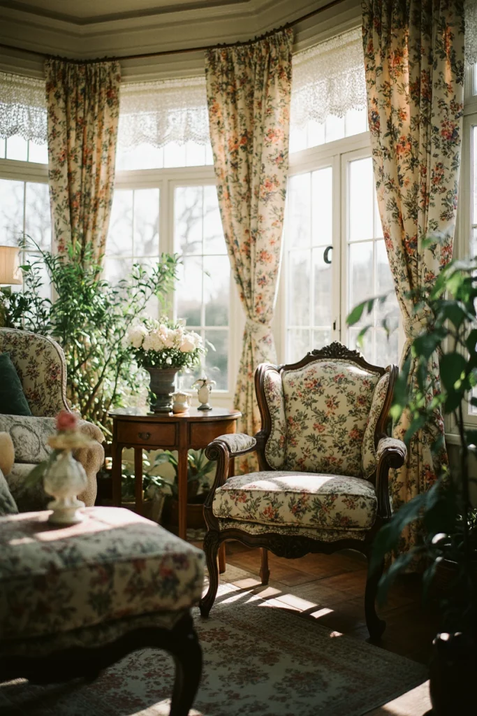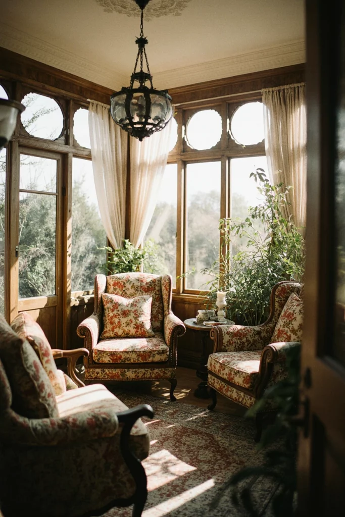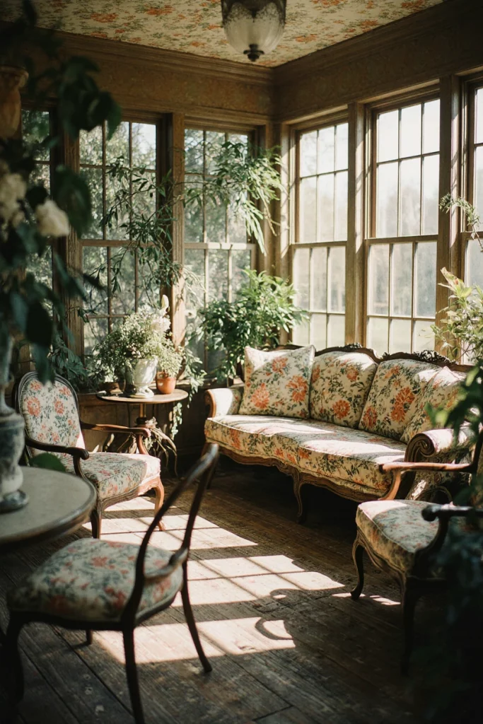 A vintage floral sunroom blends antique furniture with patterned textiles and delicate décor elements. This style resonates with homeowners who love meaningful objects and nostalgic charm. Soft colors and traditional patterns make the space feel cozy and warm, particularly in older homes with character-filled architecture. Adding greenery keeps the room from feeling too formal and gives it a lively, personal atmosphere.