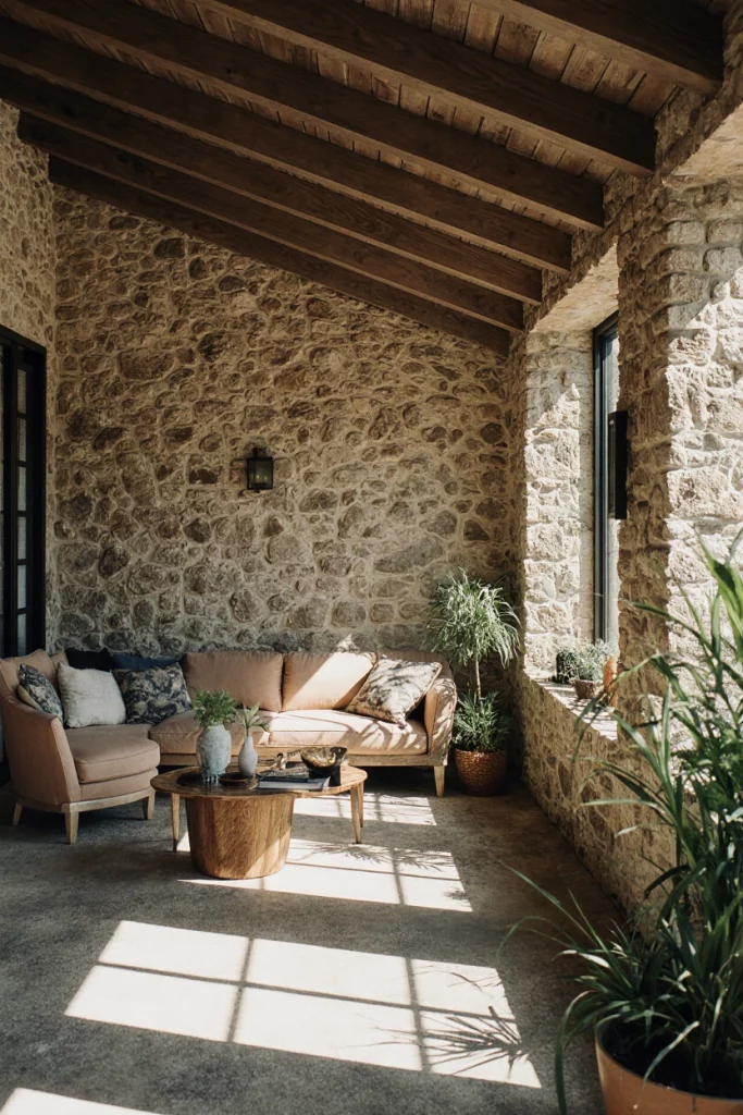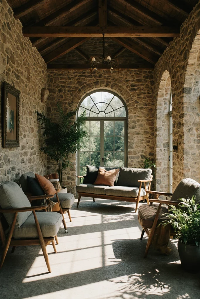A rustic sunroom with stone accents brings a natural, grounding feeling that many homeowners appreciate. Whether using a full stone wall or subtle touches, the texture adds depth and warmth. This design suits porch conversions, cabins, and traditional homes. With layered fabrics and greenery, the room becomes a comforting retreat ideal for slow mornings or evening relaxation. The look is timeless yet perfectly suited for 2026 homes.
