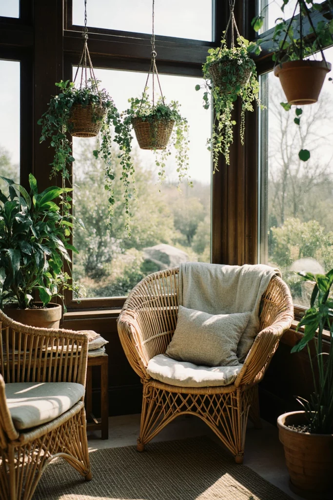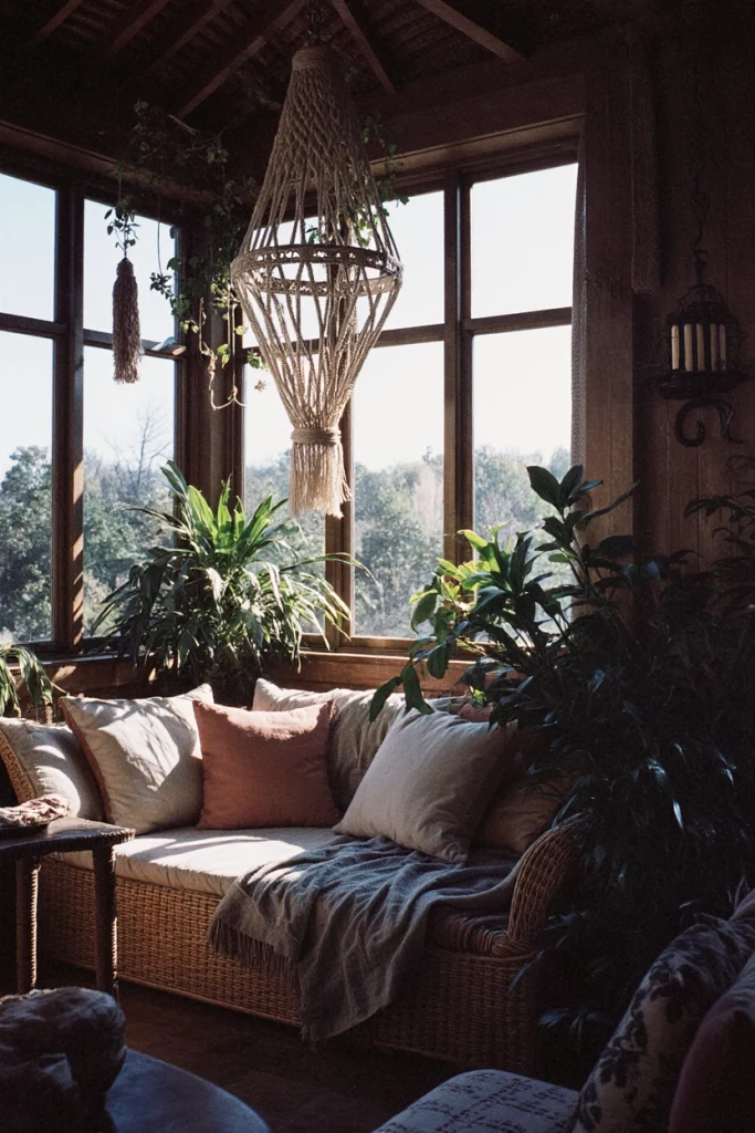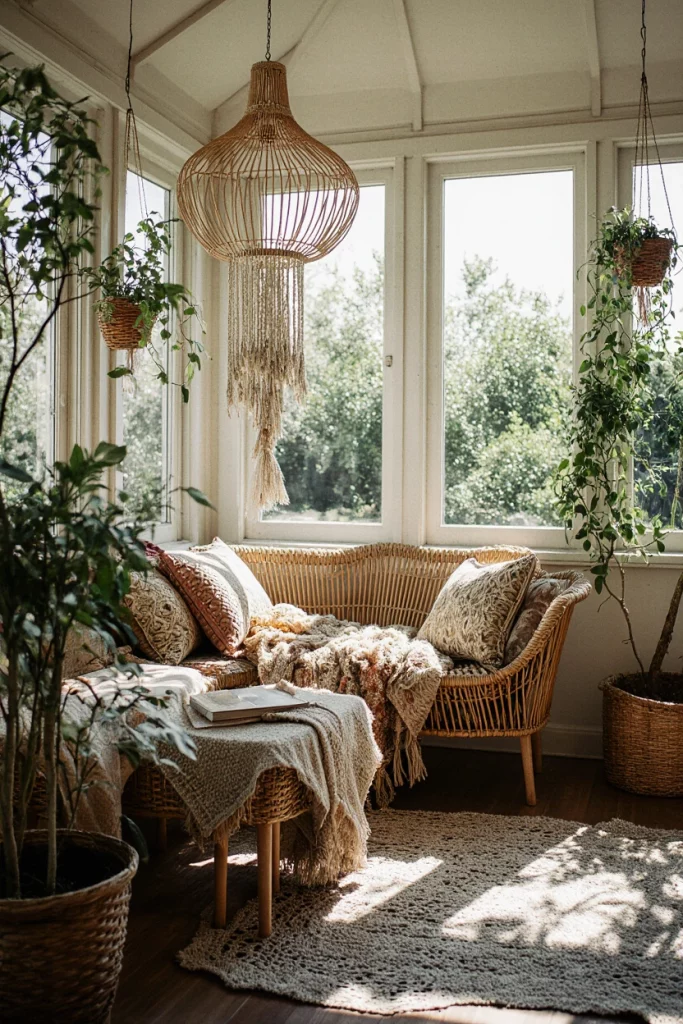 A boho sunroom brings a soft, layered feel through natural fabrics, warm woods, and expressive decorating accents. Rattan chairs, macramé, and leafy plants create a relaxing vibe that feels lived-in and personal. Many people say this style reminds them of carefree summer afternoons, even in colder months. It suits both apartments and larger homes and offers a creative yet grounded space where you can unwind and reconnect with yourself.