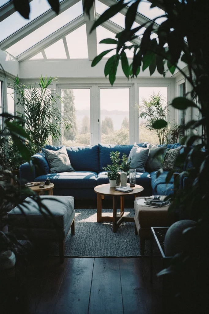 A modern coastal moody sunroom blends deep ocean hues with clean lines and soft lighting. This fusion style is ideal for homeowners who want both calm and depth in their spaces. With dark blues, natural fibers, and carefully placed plants, the room feels sophisticated yet relaxing. It’s perfect for evening unwinding, weekend lounging, or quiet conversation. The contrast between shadows and soft light creates a memorable, atmospheric interior.