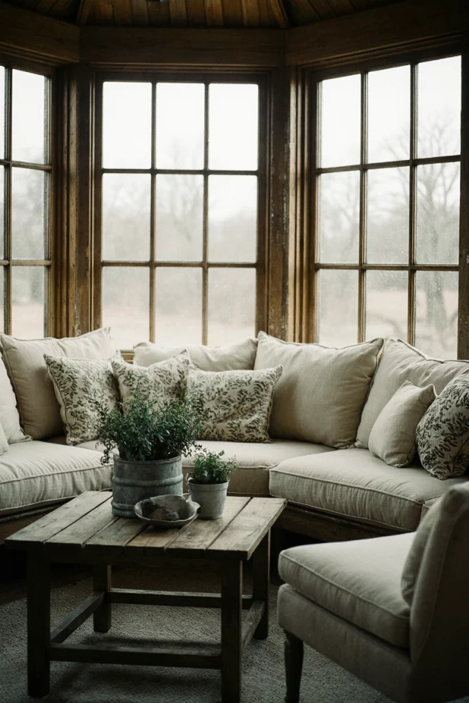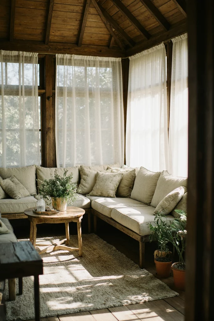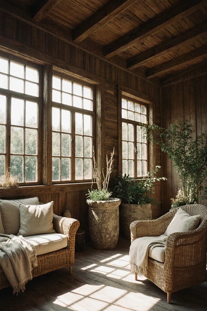 A rustic sunroom inspired by old porch designs mixes reclaimed wood, earthy fabrics, and natural tones to create a grounded, homelike feel. Many people say it reminds them of childhood summers spent at a cabin or visiting relatives. This style works beautifully in both older homes and newly built spaces, giving the room a timeless identity. It’s especially inviting for quiet mornings when the light filters through textured materials.
