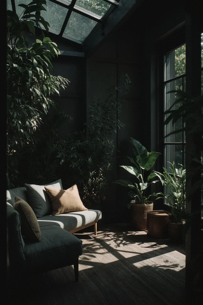 A moody sunroom uses darker tones, dramatic lighting, and textured décor to create a space that feels intimate and deeply relaxing. Designers often recommend this style for people who want something bold yet soothing. Deep colors, layered fabrics, and soft shadows can transform a simple room into a standout retreat. Pairing this palette with greenery adds a touch of organic balance.