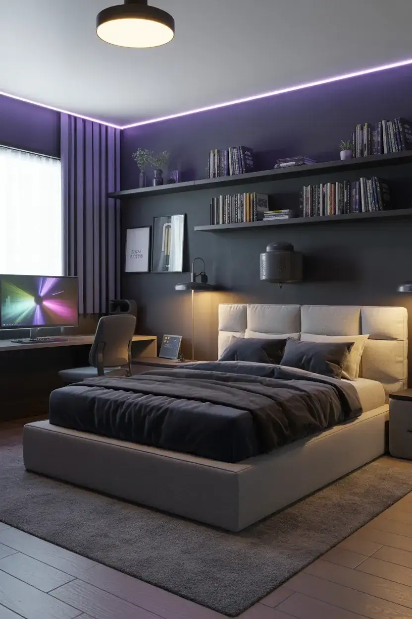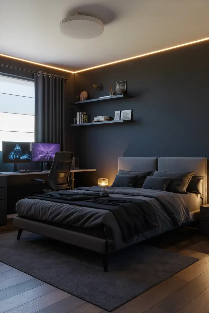 There’s a reason dark-walled rooms keep showing up on every design feed—they—they just feel immersive in a way that lighter rooms don’t. For a teenage boy who’s into gaming, a deep charcoal, navy, or near-black wall creates the perfect backdrop for LED strips, monitor glow, and all the tech that defines his world. This works brilliantly for emo and edgier aesthetics too, where moodiness is a feature, not a flaw. Add a low-profile platform bed, floating shelves, and a serious desk setup, and the room becomes a genuine retreat.