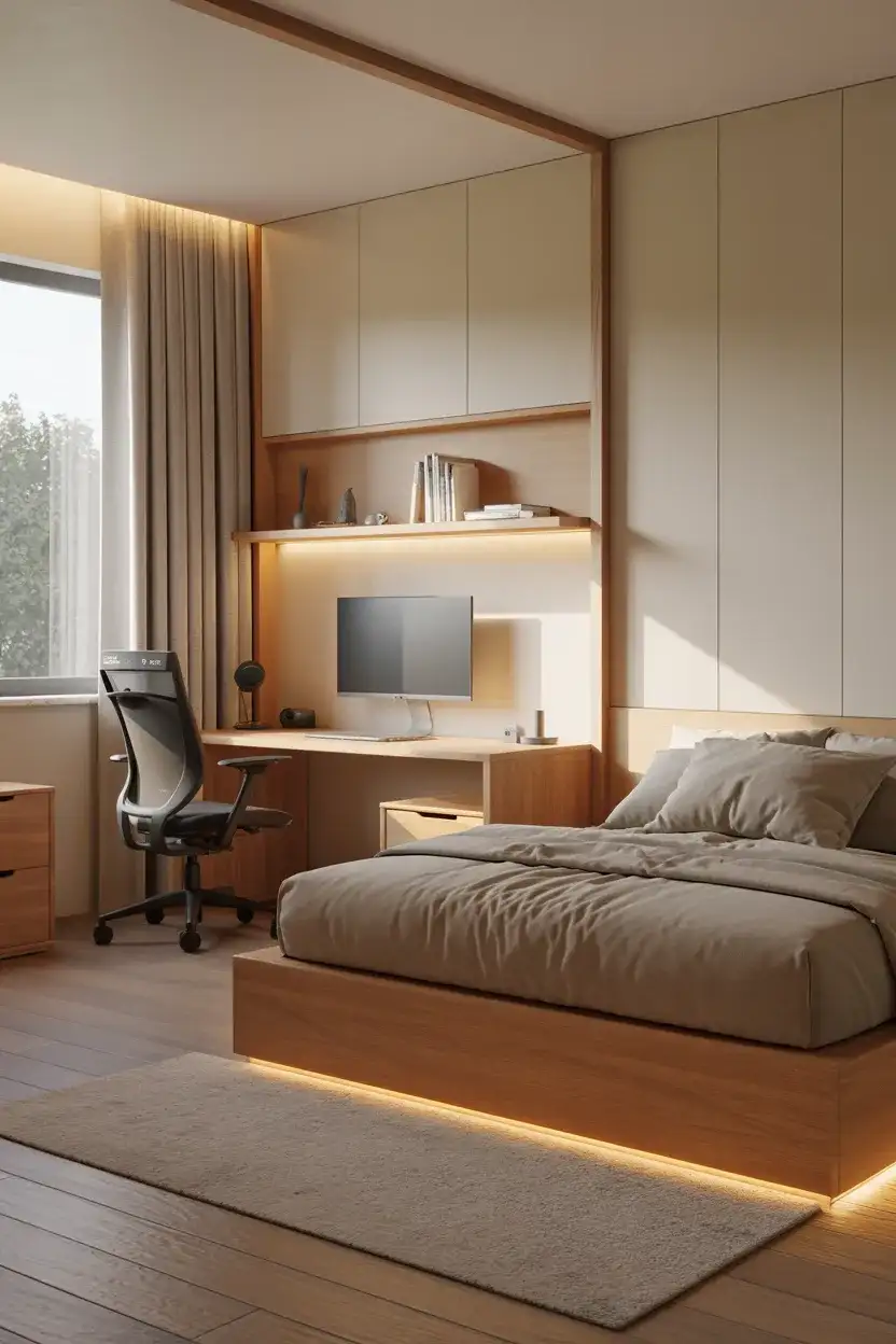 The most interesting bedrooms of 2026 aren’t purely one thing—they’re hybrids, and the Japandi-meets-gamer mashup might be the most compelling one. Imagine a room with all the calm material palette of Japandi (warm wood, cream linen, clean lines, natural textures) but with a fully integrated, beautifully disguised gaming setup: a monitor that folds away or is mounted flush with a minimalist desk, cable management that hides all the tech, and RGB lighting dialed to a warm amber that doesn’t fight the organic aesthetic of the room. This is the room for the thoughtful gamer—someone who wants both peak performance and genuine calm in their space.