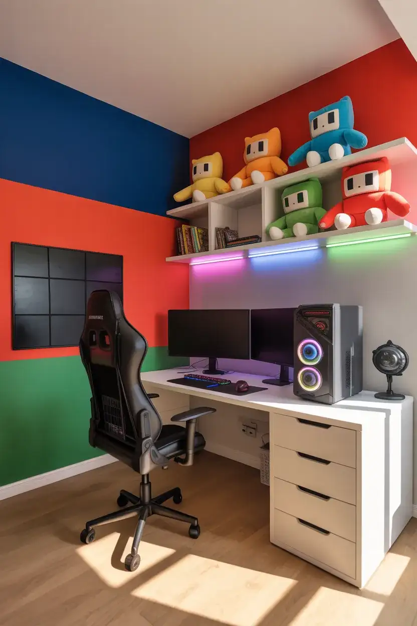 If a full Roblox color treatment sounds overwhelming, start smaller: a single color-blocked wall (painted in three horizontal bands of the game’s signature colors) behind the gaming desk creates the focal point without committing the entire room. It’s a weekend project that costs under $60 in paint and tape, and the result is genuinely striking in photos—which—which matters enormously to the Pinterest-and-social-media generation that’s going to want to show their friends.